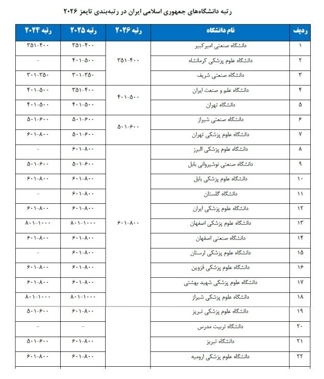 پایگاه رتبه‌بندی تایمز در سال 2026  فهرستی از 2191 دانشگاه و موسسه پژوهشی از 115 کشور در سراسر دنیا را درآخرین رتبه بندی خود منتشر نموده است. در این لیست تعداد 90 دانشگاه از ایران مشاهد میشود که دانشگاه صنعتی شیراز با کسب رتبه در بازه 600-501 در سومین بازه رتبه بندی انجام شده در کشور قرار دارد. بر اساس این لیست دانشگاه های امیرکبیر، صنعتی شریف و علوم پزشکی کرمانشاه در بازه 400-351 ، دانشگاه علم و صنعت ایران و دانشگاه تهران در بازه 500-401 ، دانشگاه صنعتی شیراز و علوم پزشکی تهران در بازه 600-501 قرار داشته و سایر دانشگاه های کشور شامل 83 دانشگاه در بازه 601 به بالا قرار دارند. همانطور که از جدول ملاحظه میشود تنها 7 دانشگاه کشور در رتبه بندی سال 2026، رتبه زیر 600 قرار گرفته است. در رتبه بندی سال 2025 از ایران تعداد 81 دانشگاه حضور داشت که دانشگاه صنعتی شریف در رتبه 350-301 ، دانشگاه های امیر کبیر و علم وصنعت ایران در رتبه 400-351، دانشگاه علوم پزشکی کرمانشاه و دانشگاه تهران در رتبه 500-451 قرار داشتند. همچنین دانشگاه صنعتی نوشیروانی بابل، دانشگاه صنعتی شیراز و دانشگاه علوم پزشکی تهران در رتبه 600-501 قرار داشتند و در مجموع 8 دانشگاه ایران دارای رتبه زیر 600 بودند. دانشگاه صنعتی شیراز با حفظ رتبه بندی گذشته کماکان در بازه سوم در میان دانشگاه های کشور و رتبه ششم کشوری قرار گرفته است.